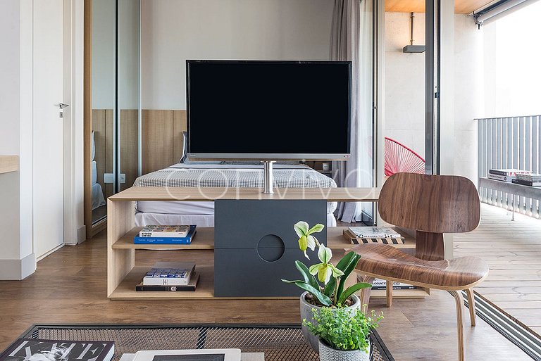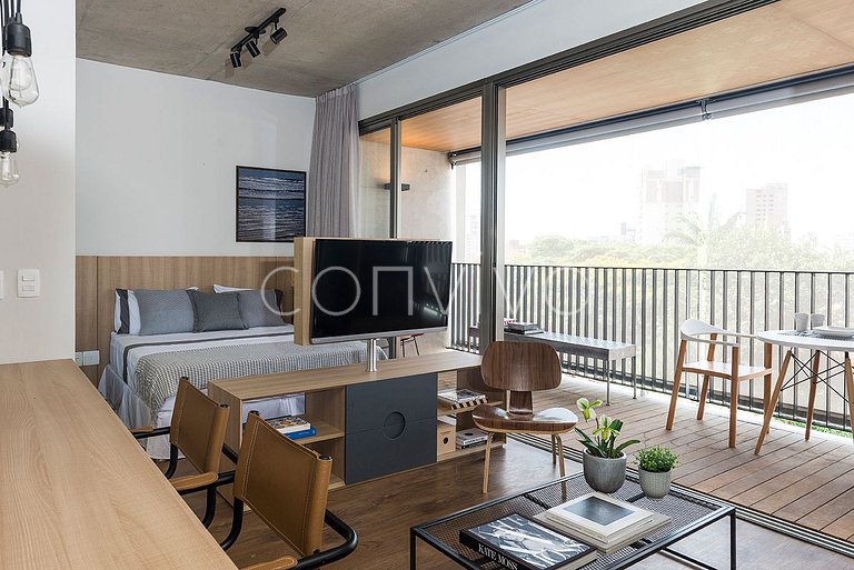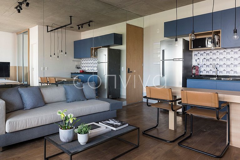 Apartamento de 44m², no 8º andar, possui uma cama queen size, sofá, banheiro, cozinha completa e varanda.
