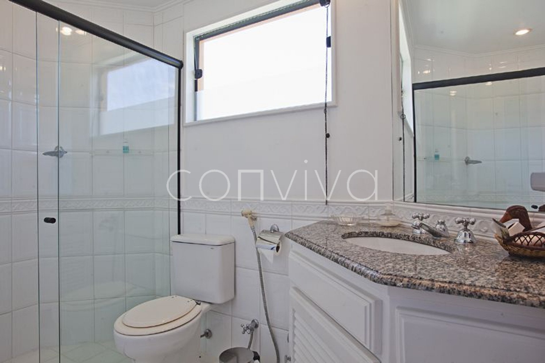Decoração clean e aconchegante. A casa possui 4 suites e 1 sala/suíte reversívelm sala com 3 ambientes com lavabo e vista para o lago. No quintal, uma piscina com solário, churrasqueira e freezer para bebidas. Casa geminada, possui escadas.